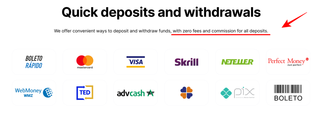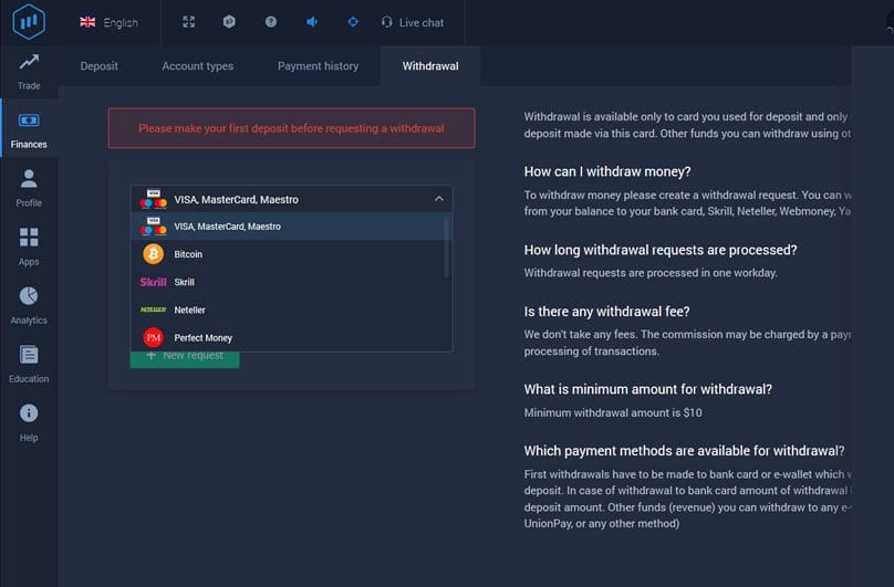 - Existem várias opções de saque de dinheiro: transferência bancária, WebMoney, Perfect Money, Payeer, Advcash, Jeton, VLoad, cartões Visa, Mastercard, Maestro.