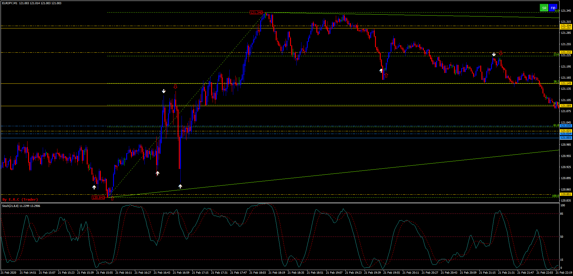 Se você estiver negociando o índice S&P 500 durante a sessão de Nova York e a TMA True mostrar uma seta enquanto o oscilador estocástico cruza para cima o nível 20, você colocaria uma ordem de compra.