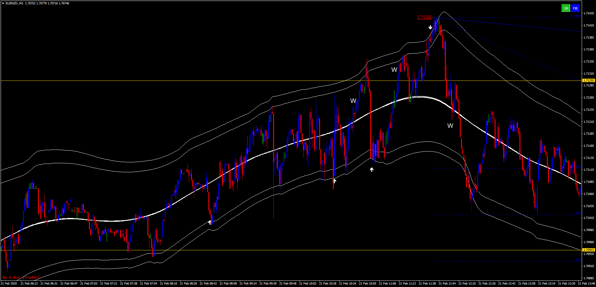 Suponha que você esteja negociando o par EUR/USD durante a sessão de Londres. Se a TMA True (56, 100 ATR período 2.0 desvio) mostrar uma seta abaixo das bandas das TMAs (72, 4, 2.9) e (72, 4, 3.6), você colocaria uma ordem de compra com expiração de 10-15 velas.
