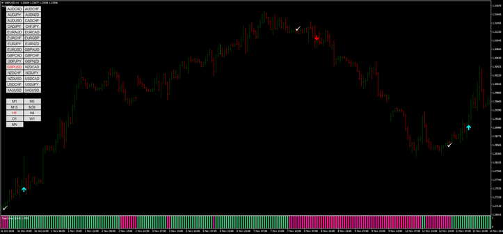 O Indicador de Seta de Sinal gera sinais de compra e venda diretamente no gráfico, usando setas para indicar os pontos de entrada. Cada seta é acompanhada de um alvo de lucro, o que facilita o gerenciamento das posições: