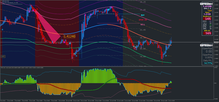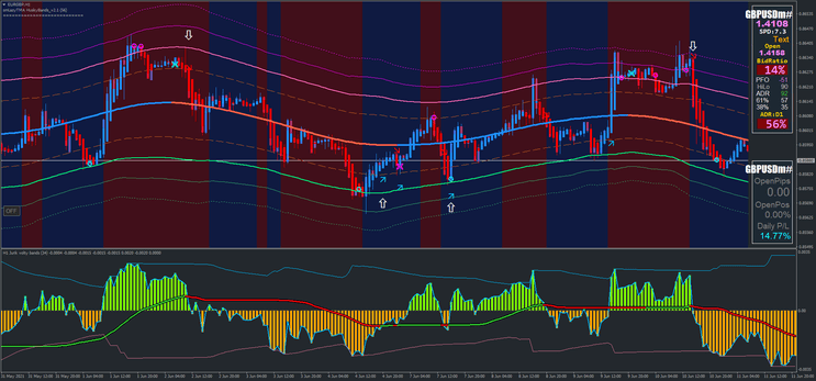 • Descrição: O preço rebate na linha rosa sólida da TMA ou quebra abaixo dela. Uma seta de venda é gerada pelas Jurik Volty Bands, confirmando uma possível continuação da tendência de baixa.
