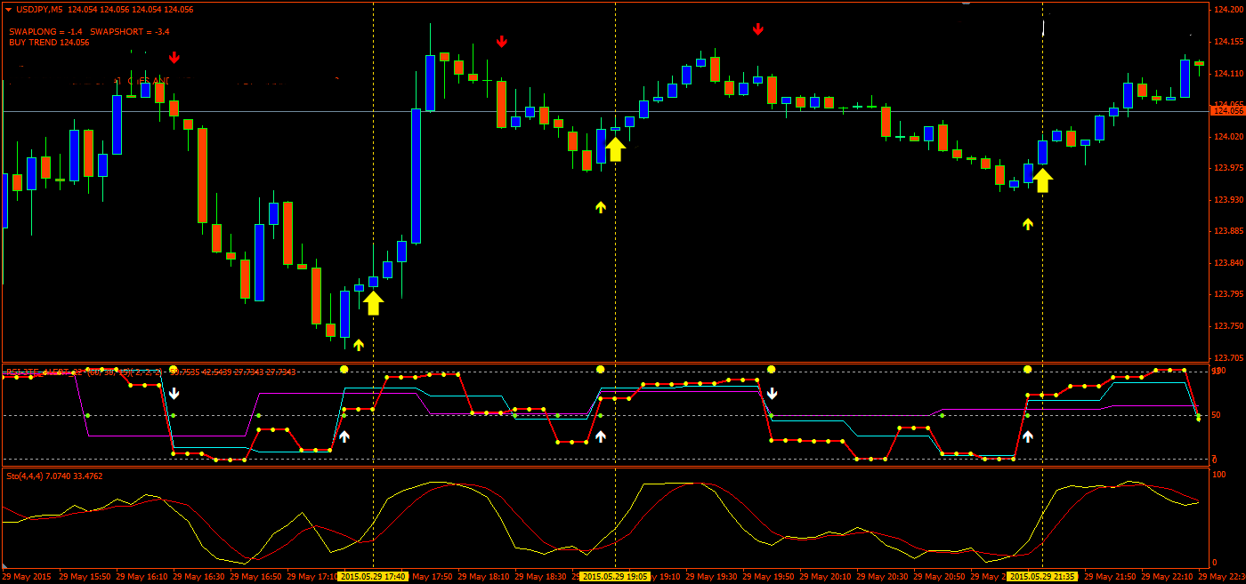 - A linha amarela do Stochastic está acima da linha vermelha.
