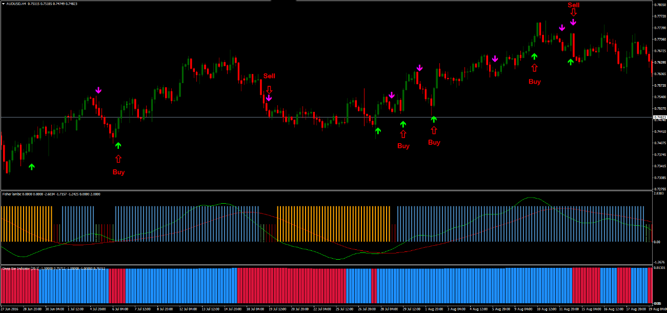 • A confirmação dos sinais de entrada é feita quando dois dos três indicadores (seta de compra/venda, Fisher Lambic, e Deep Bar Indicator) estão alinhados na mesma direção.