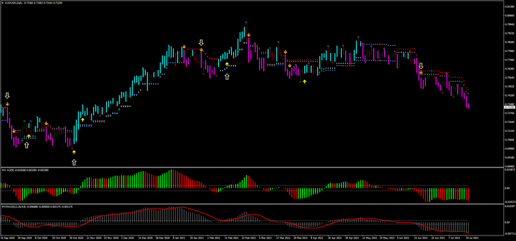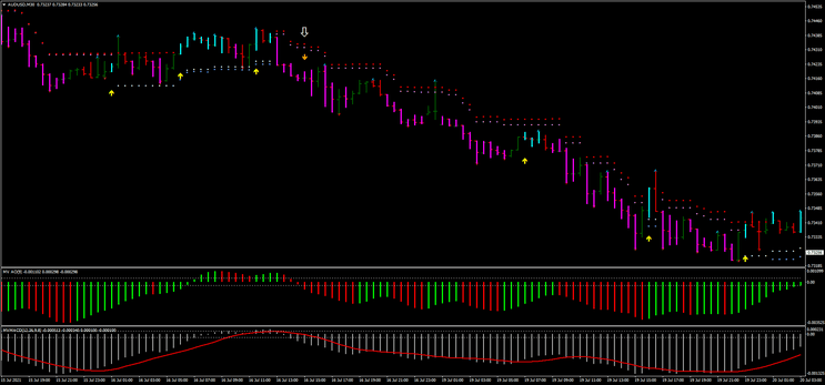 - Propósito: Fornece sinais adicionais com base na volatilidade atual do mercado, representada por pontos abaixo ou acima das velas no gráfico.