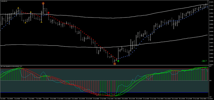 • O RSI de 21 períodos cruza as linhas suavizadas do RSI para cima e aparece uma barra verde no histograma do RSI.