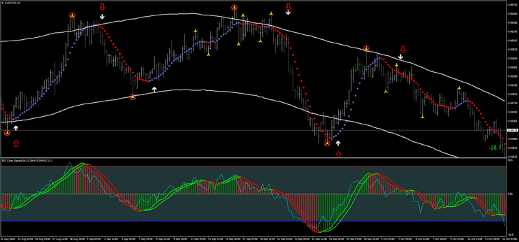 O sistema incorpora o RSI (Índice de Força Relativa) com configurações adaptadas para períodos de 14, 7 e 21. Ele é utilizado para identificar condições de sobrecompra e sobrevenda, complementando a análise de tendências fornecida pelo Half Trend e pela média móvel não lag.
