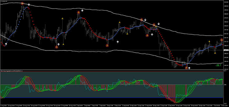 • O RSI de 21 períodos cruza as linhas suavizadas do RSI para baixo e aparece uma barra vermelha no histograma do RSI.