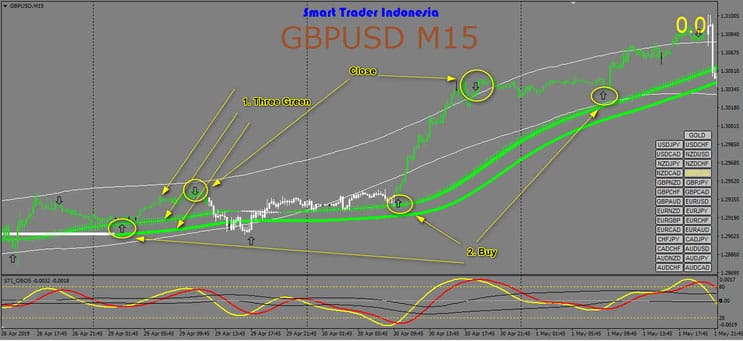 - STI Obos Oscillator: Seta de compra e barra verde dentro de três barras.